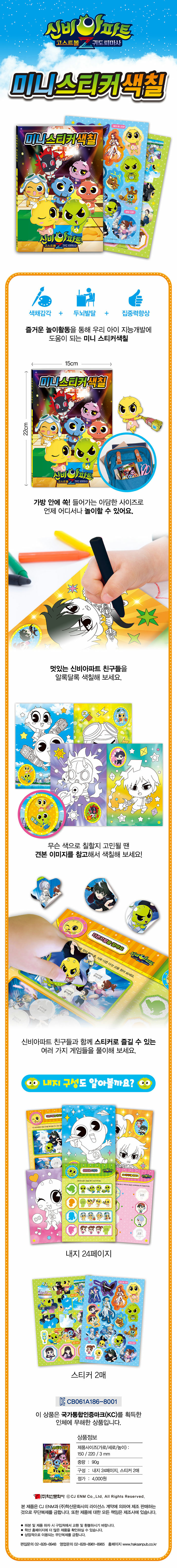 아이들에게 인기만점 스티커색칠놀이가 귀여운 미니 사이즈로! 색칠,스티커 놀이와 재미있는 게임을 통해 아이들의 지능을 향상시키는 IQ, EQ개발 프로그램이다. 페이지마다 좋아하는 캐릭터를 칠하면서 소근육 활동이 늘어나 집중력과 창의력이 발달된다. 손과 눈의 협응력을 길러주며 자연스럽게 형태와 색채의 감각을 익힐 수 있다. 자신만의 개성있는 컬러색칠을 통한 놀이활동은 독창성을 키워준다. 스티커놀이와 다양한 게임을 통하여 복합적인 사고력과 응용력이 발달한다.