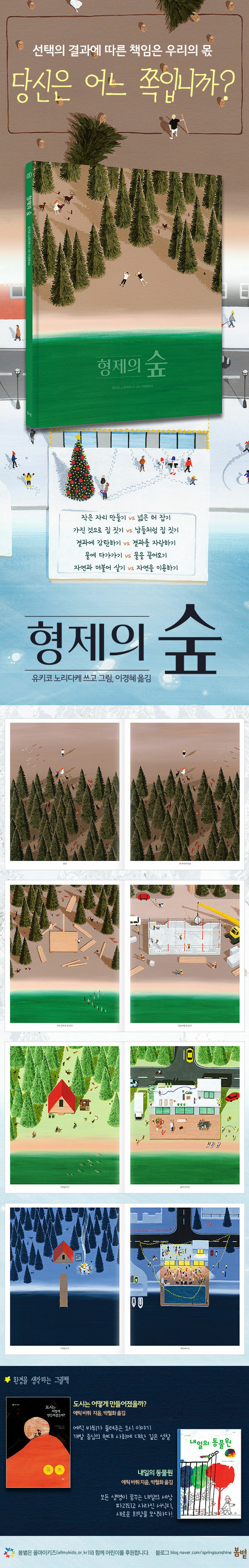 당신은 어느 쪽입니까?하루가 멀다 하고 기후변화가 심각하다, 기후 위기에 봉착했다, 지구 온도가 1.5도나 올라갔다, 인간이 지구를 너무 과도하게 사용하고 있다 등등의 뉴스가 나오고 있다. 환경 문제만큼은 사람들이 방관자 모드를 취하는 편이라고 하는데, 이젠 더 이상 방관자로 지켜볼 수 없을 만큼 심각한 사태를 맞이했다. 평소와 같지 않은 산불, 태풍, 홍수 등은 대체로 기후변화에서 기인한다고 한다. 그렇다면 지구를 위해, 지구에서 살아가고 있는 인간을 위해 우리는 무엇을 해야 할 것인가? 탄소중립부터 수많은 솔루션은 제안되고 있지만 실천하는 일은 그리 쉽지 않거나, 개인의 실천이 얼마나 큰 변화를 가져오겠어 하는 회의감도 든다. 전 연령이 다 봐도 좋은 그림책 《형제의 숲》은 지금 우리에게 “당신은 어느 쪽입니까?”라는 질문을 던지고 있다. 《형제의 숲》을 함께 보면서 우리는 지구를 위해, 아니 우리를 위해 무엇을 해야 하는지 수많은 이야기를 나눌 수 있을 것이다.