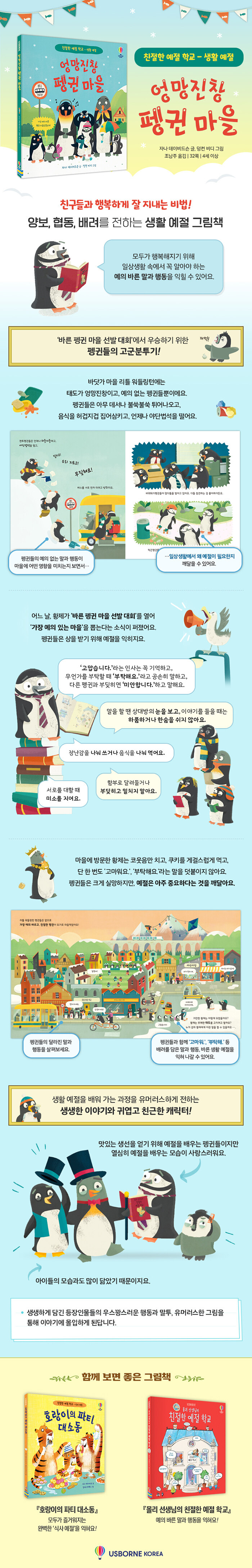 생활 예절 그림책「친절한 예절 학교」시리즈의 생활 예절 편『엉망진창 펭귄 마을』은 자기밖에 모르고, 태도가 엉망진창인 펭귄들이 모여 사는 리틀 워들링턴 마을에 ‘가장 예의 바른 펭귄 마을’을 뽑는 대회가 열리자 상을 받기 위해 펭귄들이 양보, 협동, 배려를 배우고 변화되는 모습을 담은 이야기예요. 이야기를 통해 예의 바른 말과 행동이 우리의 삶을 어떻게 바꾸어 나가는지, 무례한 행동이 다른 사람들에게 어떤 영향을 미치는지, 생활 속에서 꼭 필요한 예의 바른 말과 행동을 익힐 수 있답니다.