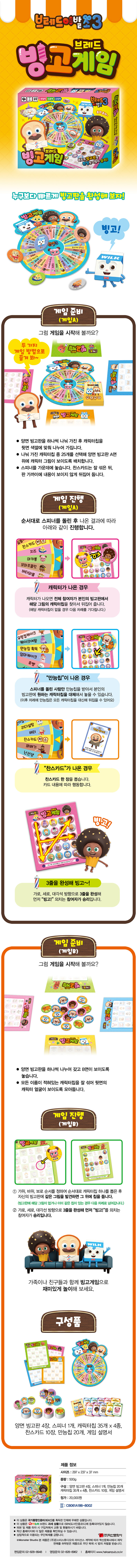 스피너 1개, 양면 빙고판 4장, 캐릭터칩 35개x4종, 찬스카드 10장, 만능칩 20개, 설명서