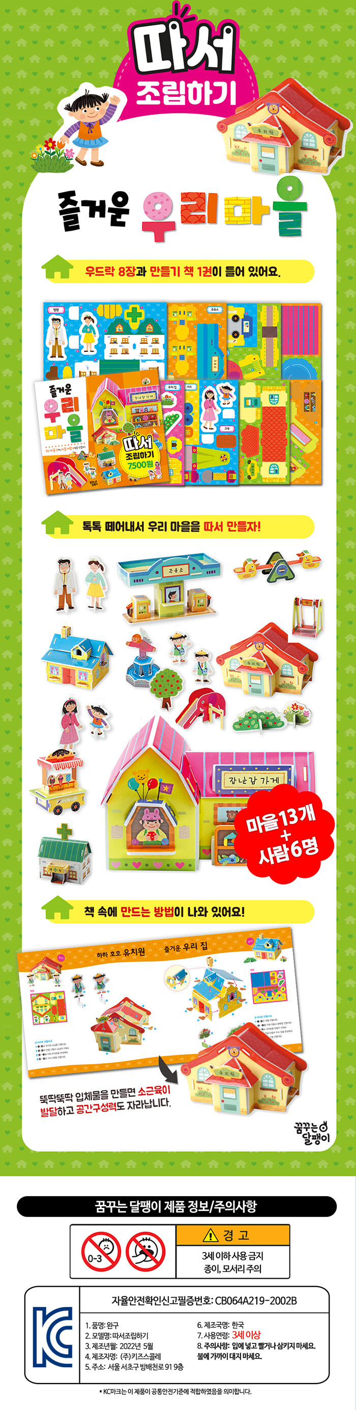 우드락을 뜯어내어 홈에 끼우기만 하면 시소, 미끄럼틀, 우리 집, 장난감 가게 등 우리 마을 13개와 마을 사람 6명을 만들 수 있다. 손가락에 힘을 주어 톡톡 뜯어내고, 쏙쏙 끼우다 보면 소근육이 발달하고, 여러 모양의 입체물을 만들면서 공간구성력도 쑥쑥 자라난다.