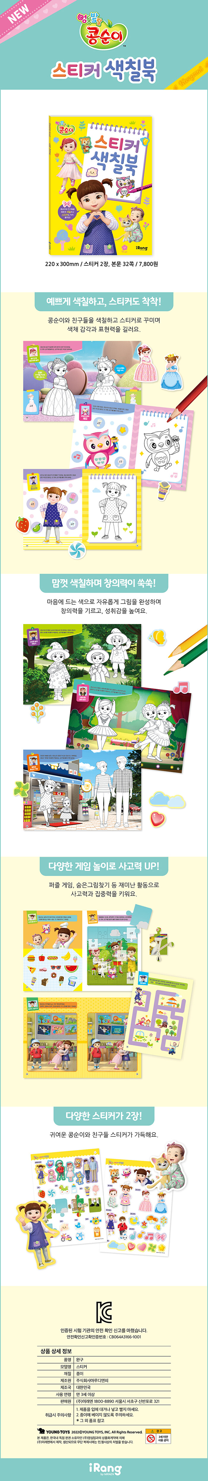 콩순이와 친구들을 예쁘게 색칠하고, 스티커를 붙여 꾸며 보자. 내 친구 콩순이, 귀여운 콩콩이,부엉이 래퍼 세요까지 내가 좋아하는 캐릭터를 완성해 가는 활동을 통해 색채 감각과 표현력을 기를 수 있다.