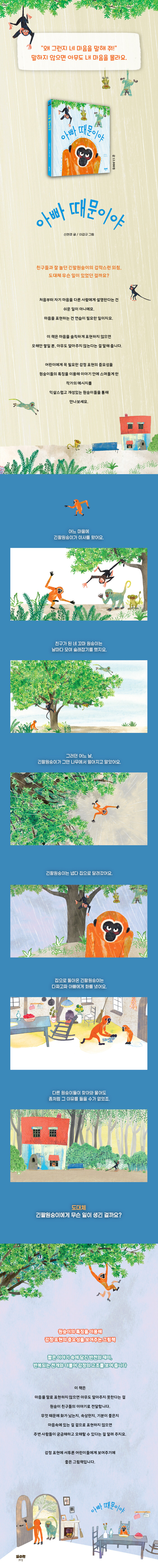 나중에 긴팔원숭이가 쭈뼛거리며 속마음을 털어놓자, 그제서야 다들 몰랐다며 미안해하고, 말해 줘서 고맙다고 이야기하지요. 마음을 솔직하게 표현하지 않으면 오해만 쌓일 뿐, 아무도 알아주지 않는다는 걸 《아빠 때문이야》에서 말해 줍니다.