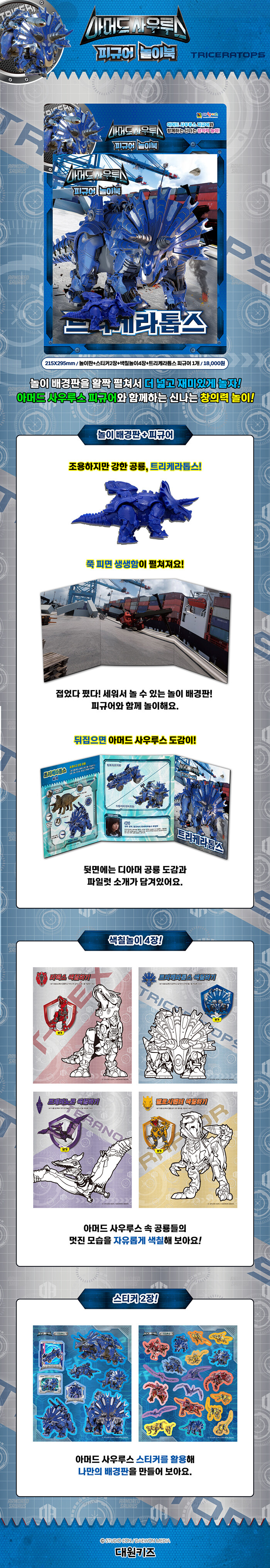 아머드 사우루스 피규어와 함께하는 신나는 창의력 놀이. 접었다 폈다 세워서 놀 수 있는 놀이 배경판으로 피규어와 함께 놀이한다. 뒷면에는 디아머 공룡 도감과 파일럿 소개가 담겨있다. 아머드 사우루스 색칠놀이 4장과, 스티커 2장이 함께 들어있다. 공룡들의 멋진 모습을 자유롭게 색칠하고, 스티커를 활용해 나만의 배경판을 만들어 보자.
