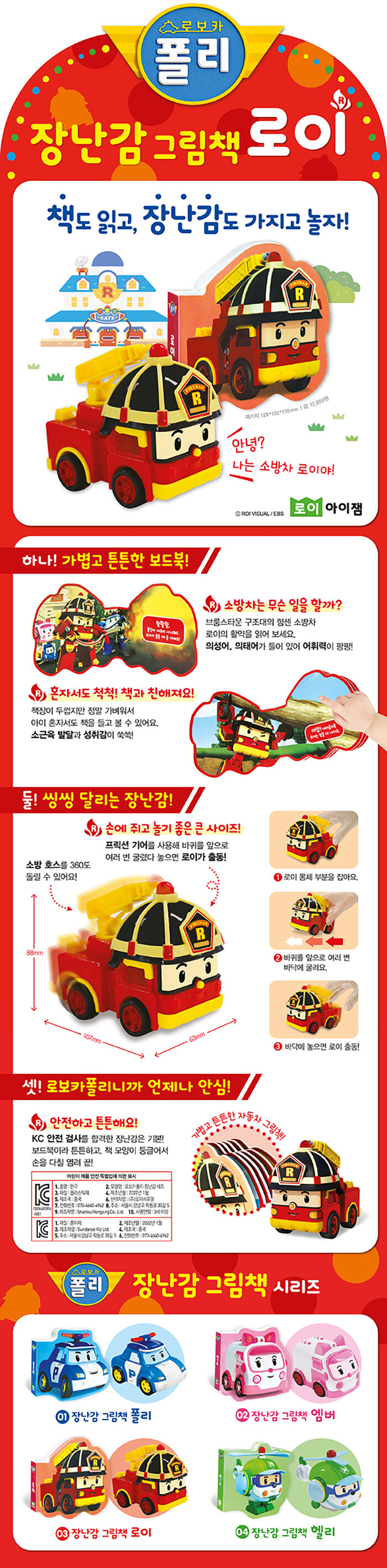 책도 읽고, 장난감도 가지고 놀아요! 접으면 장난감처럼 놀 수 있고, 펼치면 재미있게 읽을 수 있는 보드북 그림책과 로보카폴리 구조대의 힘센 소방차 로이 자동차 완구를 동시에 만나 보세요!