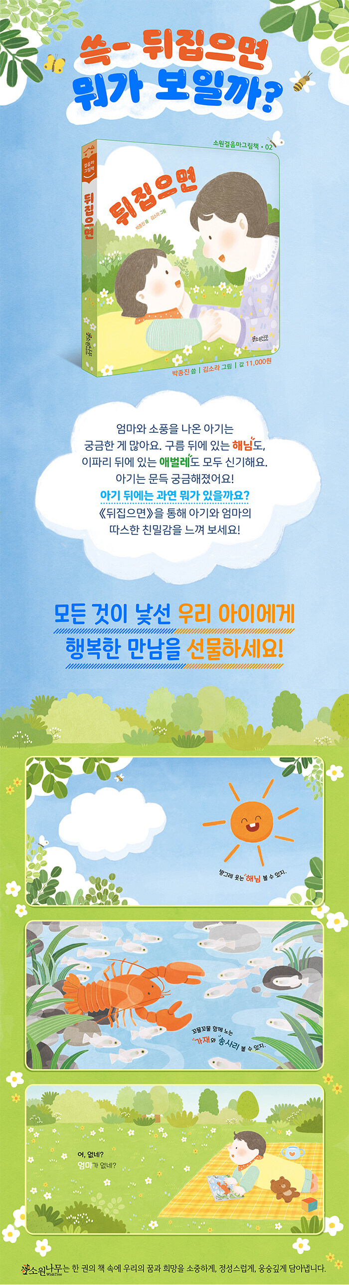 소원걸음마그림책 2권. <뒤집으면>은 호기심 많은 아기와 뒤를 돌아보면 언제나 곁에 있는 엄마의 따스한 친밀감이 담긴 영유아 그림책이다. 새하얀 구름 뒤에는 따뜻한 해님이 있고, 풀밭의 이파리 뒤에는 잠자는 애벌레가 있고, 아기 뒤에는 언제나 다정한 눈길로 엄마가 기다리고 있다. 아기는 다양한 경험을 통해 눈에 보이는 세상 뒤에 숨은 엄마의 따뜻한 사랑을 느낄 수 있다.