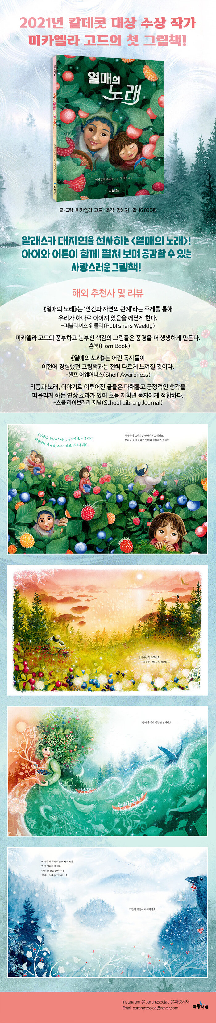 실제로 이 책의 저자인 미카엘라 고드는 알래스카의 틀링기트족 출신으로 바닷 마을에서 자랐습니다. 저자는 대자연에서 느꼈던 기쁨과 감사를 전 세계 독자들과 함께 나누고 싶은 염원을 그림책에 담았습니다. 더불어 알래스카의 풍경과 숲속 열매에는 저자가 고향 땅에서 직접 겪은 경험담과 추억들이 담겨 있습니다. 붓질이 생생하게 담긴 그림에는 작가만의 정취가 고스란히 녹아 알래스카 틀링기트족으로서 갖는 자부심과 긍지가 느껴집니다.