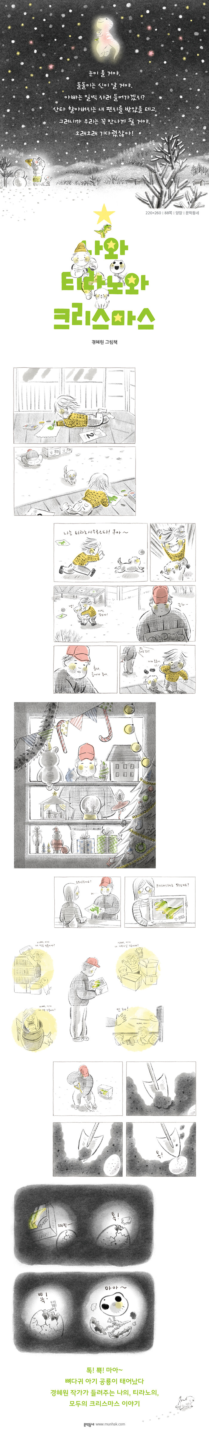 경혜원 작가가 들려주는 나의, 티라노의, 모두의 크리스마스 이야기 바람은 차겠지만 툇마루에 배를 깔고 엎드려서 놀 만은 한 11월의 오후 볕이다. 아이는 크레파스로 달력 뒷장 하얀 종이에 제가 좋아하는 것들을 몽땅 그린다. 수염이 까끌한 아빠 얼굴, 하나뿐인 단짝이지만 생각만큼 잘 그려지지는 않는 강아지 돌돌이, 그리고 티라노, 티라노사우루스!