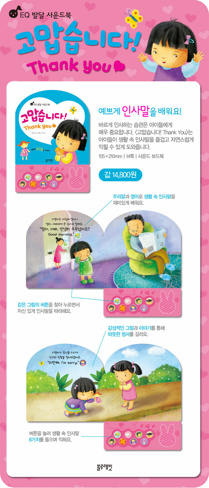 버튼을 누르면 귀여운 목소리로 인사말이 흘러 나온다. 감성적인 그림 속에 담긴 이야기를 읽다 보면 어떤 상황에 필요한 인사말인지 깨닫게 됩니다. 또한, 인사를 나누는 것이 기분 좋은 일이라는 것을 재미있는 이야기를 통해 간접적으로 경험할 수 있다.