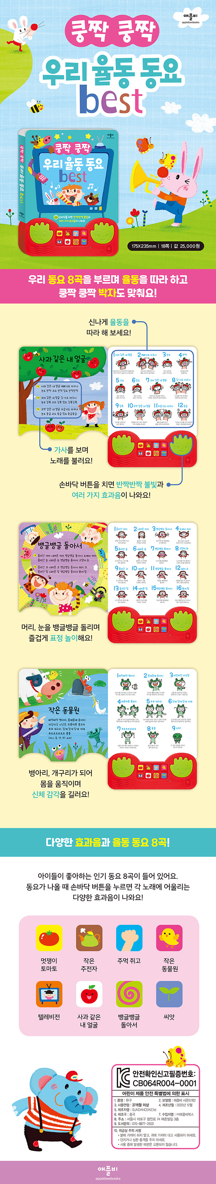 버튼을 눌러 8곡의 동요를 들으며 신나는 율동을 해 보는 율동 동요 사운드북이다. 손바닥 모양의 리듬 버튼을 누르면 예쁜 불빛과 함께 각 노래에 어울리는 다양한 효과음이 나온. 또 각 페이지에는 노래에 어울리는 율동 동작이 자세하게 실려 있어서, 노래를 따라 부르며 신나게 춤을 출 수 있다. 노래를 따라 부르며 즐겁게 춤을 추고, 손바닥 버튼을 눌러 다양한 소리로 박자도 맞추어 보자.