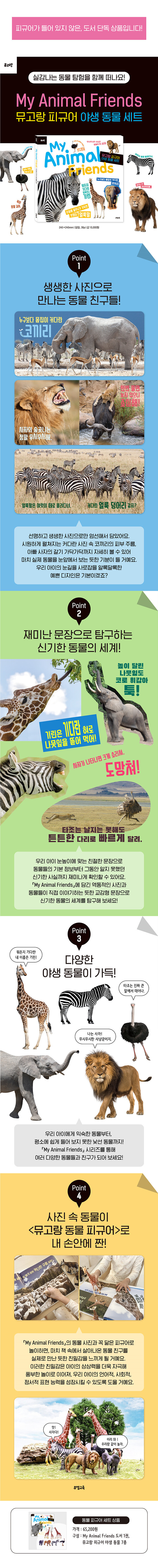 4. 뮤고랑 동물 피규어와 함께하면 더욱더 즐거워요!뮤고랑에는 『My Animal Friends』의 사진 속 동물들과 꼭 닮은 피규어들이 있어요. 책 속 동물들과 꼭 닮은 뮤고랑 피규어와 함께하는 놀이는 훌륭한 독후 활동이 되겠지요. 『My Animal Friends』에서 봤던 동물과 꼭 닮은 피규어를 접한 우리 아이는 책 속에서 살아나온 동물 친구를 실제로 만난 듯한 친밀함을 느끼게 될 거예요. 이러한 친밀함은 상상력을 더욱 자극해 풍부한 놀이로 이어져, 우리 아이의 언어적, 사회적, 정서적 표현 능력을 성장시킬 수 있도록 도울 거예요.