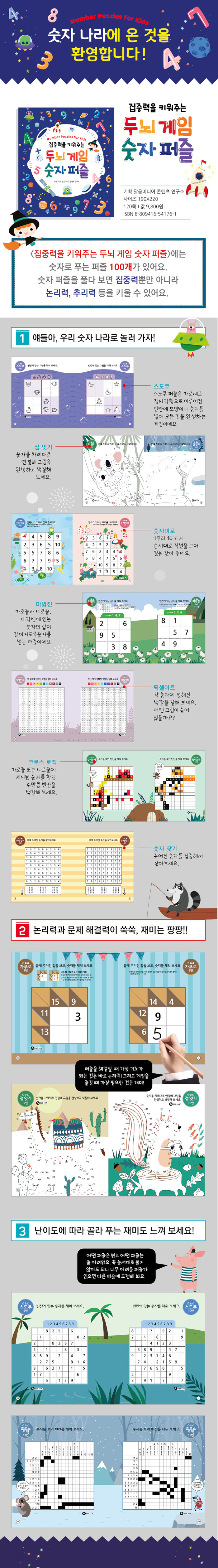 이 두 가지 요소가 만난 숫자 퍼즐책을 통해 논리력과 문제 해결력을 키울 수 있어요. 자, 이제 스마트폰, TV 등의 전자기기를 끄고 숫자 나라로 여행을 떠나 보세요!