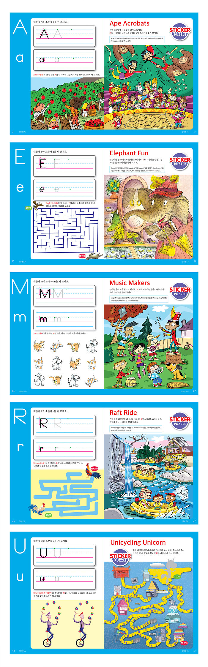숨은그림찾기, 다른 그림 찾기, 미로 찾기 등 다양한 퍼즐을 풀면서 재미있고 즐겁게 알파벳을 학습할 수 있는 책이다. 알파벳뿐만 아니라 일상생활에서 자주 쓰이는 영어 단어를 쉽게 익힐 수 있음은 물론이고 학습에 필요한 집중력과 관찰력, 운필력 등을 기르는 데에도 큰 도움을 준다. 이 책의 마지막 페이지를 넘길 즈음이면, 어느 새 영어에 흥미를 느끼는 아이의 모습을 보게 될 것이다.