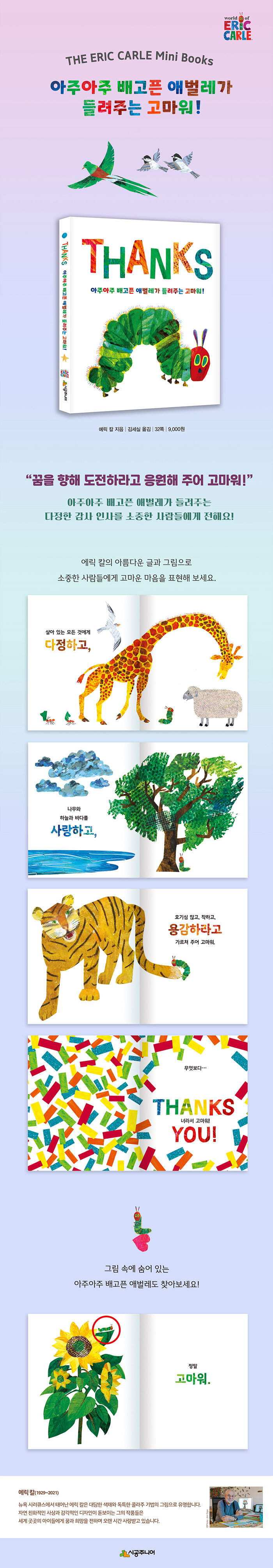 아주아주 배고픈 애벌레가 들려주는 다정한 감사 인사를 소중한 사람들에게 전해요!우리는 소중한 사람들에게 고마움을 느낄 때가 많아요. 하지만 단순히 고맙다는 말로는 진심을 전하기 부족하다고 느껴져요. 이 책에서는 아주아주 배고픈 애벌레가 “호기심 많고, 착하고, 용감하라고 가르쳐 주어 고마워.”, “나만의 노래를 부르라고 응원해 주어 고마워!” 등 고마움을 전하는 다정한 말을 들려줍니다. 에릭 칼의 독특한 콜라주로 표현된 해바라기, 기린, 나무, 구름 등 우리에게 익숙한 동식물과 자연의 모습은 이야기를 감상하는 즐거움과 함께 아이들의 인지 능력 향상에도 도움을 줄 거예요. 또한 ‘받는 사람, 보내는 사람’을 쓸 수 있는 공간이 마련되어 있어, 고마움을 전하고 싶은 사람에게 이름을 적어 선물할 수 있어요.