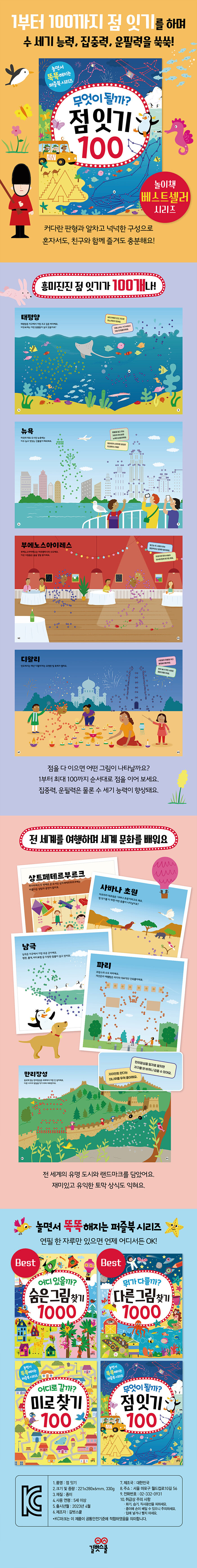 『무엇이 될까? 점 잇기 100』으로 집중력과 수 세기 능력을 키워요화려하고 예쁜 그림이 가득한 책 속에 재미있는 점 잇기가 100개나 들어 있어요. 유럽, 아프리카, 아시아, 바닷속, 설산, 열대 우림, 북극, 남극 등 전 세계를 배경으로 1부터 최대 100까지 순서대로 차근차근 점을 이어 보세요. 어떤 그림이 될지 두근두근 상상하며 점 잇기를 하다 보면 수 세기 능력은 물론, 집중력, 관찰력, 창의력, 문제 해결 능력이 쑥쑥 자라나요.