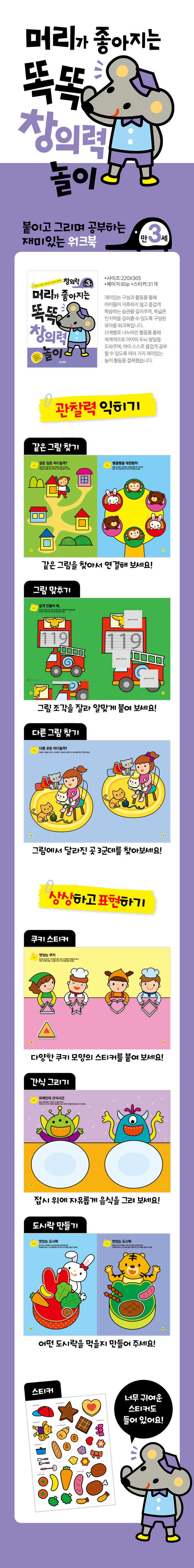 재미있는 구성과 활동을 통해 지루하지 않고 즐겁게 학습하는 습관을 길러주며, 폭넓은 인지력을 길러줄 수 있도록 구성된 유아용 워크북이다. 단계별로 나누어진 활동을 통해 체계적으로 아이의 두뇌 발달을 도와주며, 스스로 즐겁게 공부할 수 있도록 여러 가지 재미있는 놀이 활동을 접목했다.