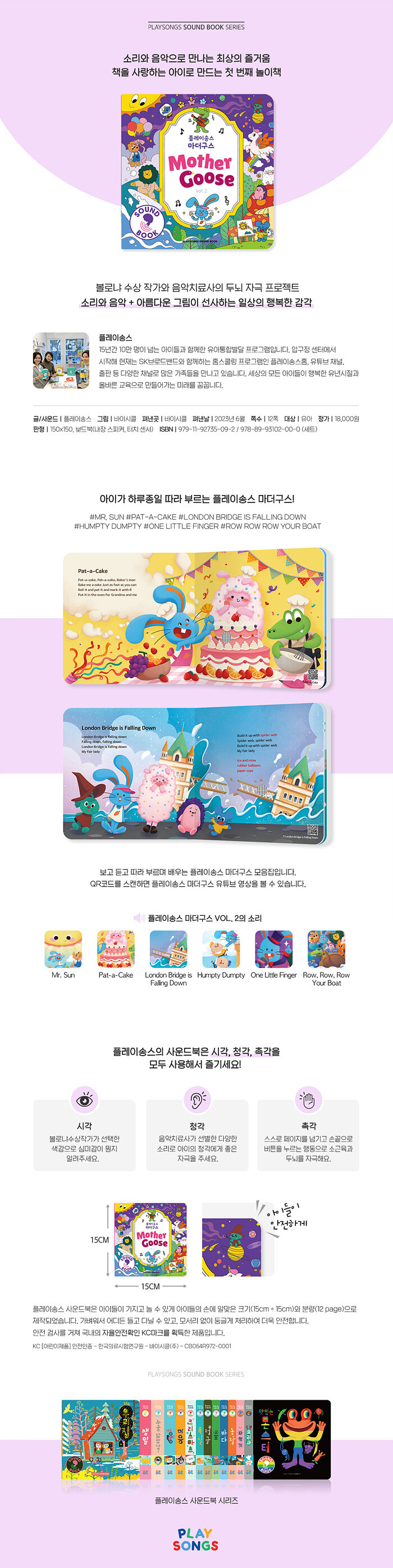 플레이송스는 15년간 어떻게 하면 아이들의 발달단계에 맞는 자극이, 아이들에게 자연스럽고 즐겁게 받아들여질 수 있을까를 연구해왔습니다. 사운드북이 나오기까지 많은 독자들의 이야기를 듣고, 리뷰하고, 시도했습니다. 아이들이 정말 좋아하는 것은 무엇일까, 아이들에게 꼭 들려줘야 할 소리는 무엇일까, 아이들의 두뇌를 깨울 적절한 자극은 어떤 것일까에 대해 답을 찾아냈습니다. - 누구보다 아이들이 재미있게 가지고 놀 수 있도록 만들었습니다.- 2023 볼로냐 국제아동도서전 수상 작가인 이경국 작가와 함게 만들었습니다.- 음악치료사가 사운드북에 맞게 음악을 편집하고, 실제 악기를 사용해 녹음했습니다.플레이송스는 압구정 센터에서 시작해 현재는 SK브로드밴드와 함께하는 홈스쿨링 프로그램인 플레이송스홈, 유튜브 채널, 출판 등 다양한 채널로 많은 가족들을 만나고 있습니다. 세상의 모든 아이들이 행복한 유년시절과 올바른 교육으로 만들어가는 미래를 꿈꿉니다.