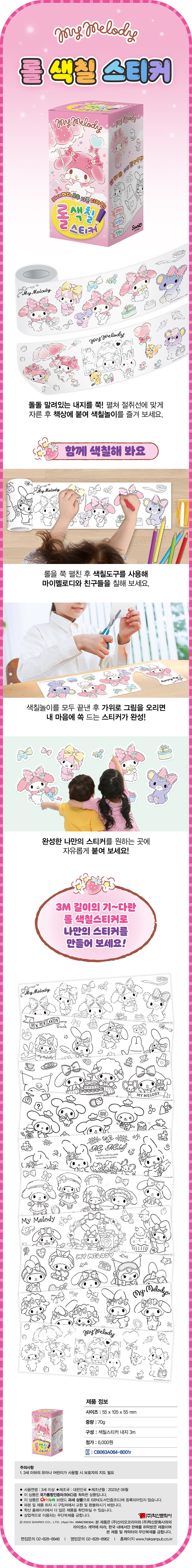 돌돌 말려있는 3M 길이의 롤을 쭉 펼치면 다양한 캐릭터 색칠놀이가 가득하다. 30cm마다 그림이 전부 달라서 다양하게 색칠놀이를 즐길 수 있다. 벽에 붙이거나 바닥에 펼쳐 놓고 자유롭게 색칠놀이 할 수 있어서 언제 어디서나 즐길 수 있어 편리하다. 색칠놀이 뒷면에는 붙였다 떼었다 할 수 있는 접착면이 있어서 그림을 완성한 후, 가위로 오려서 원하는 소지품을 스티커로 꾸밀 수 있다.