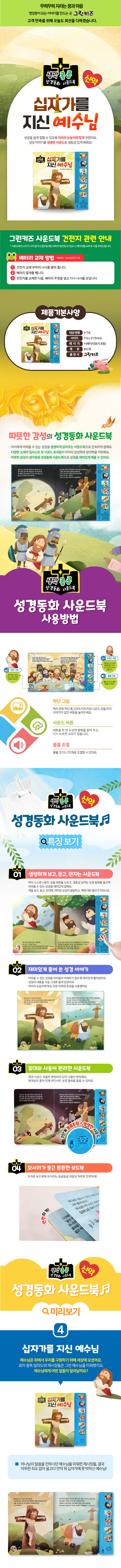 아이 스스로 사운드 모듈 버튼을 누르고, 생동감 넘치는 성경 동화를 들으며 어려울 수 있는 성경을 재미있게 접한다. 책을 보고, 듣고, 만지며, 아이의 오감이 발달하고, 책에 대한 흥미가 자라난다. 어려울 수 있는 성경을 아이들이 이해하기 쉽도록 재미있게 풀어썼다. 성경의 내용을 사실 그대로 옮겨 담았고, 아이의 눈높이에 맞는 쉬운 어휘와 문장을 사용했다.