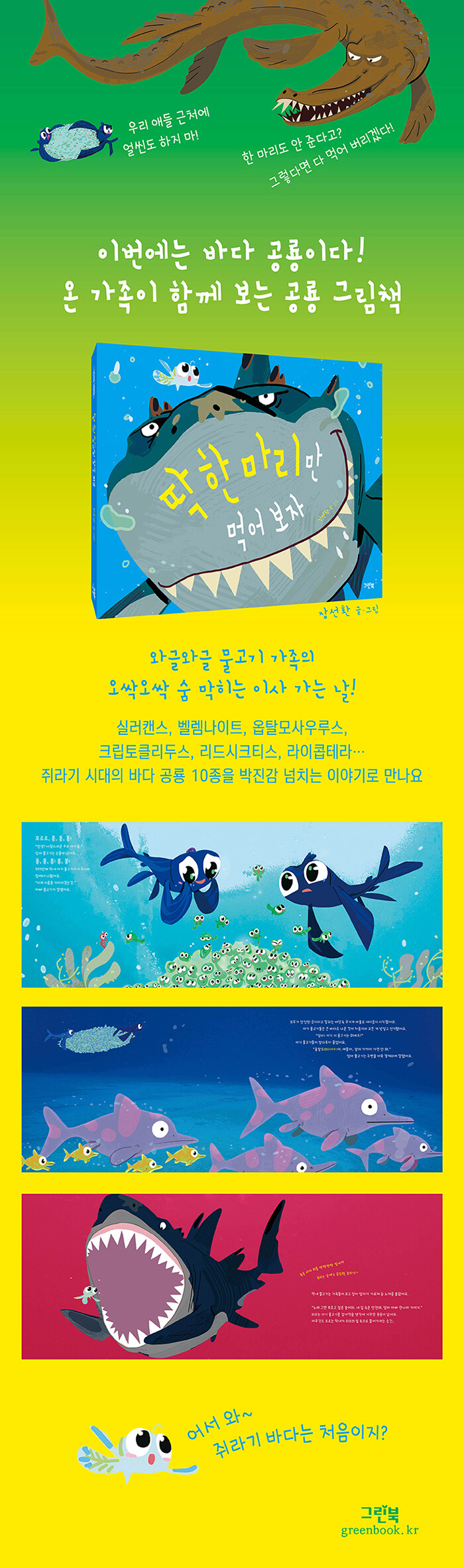 온 가족이 함께 보는 공룡 그림책!역사면 역사, 동화면 동화, 그림책이면 그림책, 장르를 넘나들며 참신하고 개성 있는 작품을 선보여 온 장선환 작가가 공룡 그림책으로 돌아왔습니다. 작은 익룡 부부가 집을 짓기 위해 고군분투하는 《네 등에 집 지어도 되니?》, 큰비에 물바다가 된 들판을 피해 공룡들이 서로 힘을 합쳐 위기를 극복하는 《우리가 도와줄게》가 쥐라기와 백악기 시대의 육지 공룡에 관한 이야기라면 이번에 그린북에서 출간되는 작가의 세 번째 공룡 그림책 《딱 한 마리만 먹어 보자》는 바닷속 공룡들의 이야기를 담고 있습니다. 공룡을 좋아하는 아이뿐 아니라 어른들도 몰입해서 재미있게 읽을 수 있습니다. 옛날 공룡 시대의 바다는 어떤 모습이었을까요? 겉으로 드러나지 않아서 더 궁금하고 신비로운 심해 속으로 모험을 떠나 보아요.