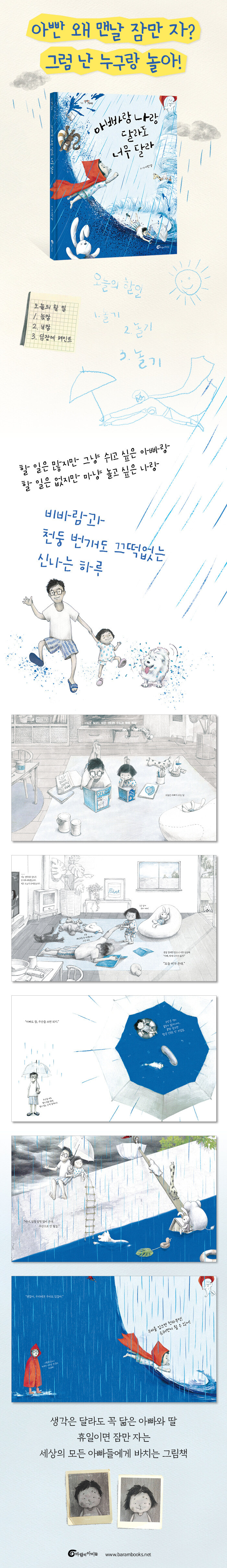 세상의 모든 아빠들에게 바치는 그림책『아빠랑 나랑 달라도 너무 달라』는 장마철이나 태풍이 불어오는 시기, 꾸물꾸물한 날씨를 꼭 빼어닮은 그림책이다. 연필화를 바탕으로 일부분이 푸른색으로 채색된 그림은 하늘에 구름이 잔뜩 끼어 있고 간간이 습한 바람이 불어오는 날씨를 온몸으로 감지하게 만든다. 그리고 아빠와 아이가 이야기를 주고받으며 밖에 나가서 놀아도 되는 이유를 찾는 동안 빗방울이 모여 파랑색 물웅덩이가 되고 아빠와 아이의 빨간 우비는 아이의 놀고 싶은 강렬한 욕망을 드러내준다. 그리고 페이지를 넘길수록 색깔이 하나씩 더해지고, 방 안에 널브러져 있던 장난감 인형들이 상상 속 모험의 길동무가 되는 동안, 그림책 페이지마다 조금씩 온기가 찾아드는 느낌이다.
