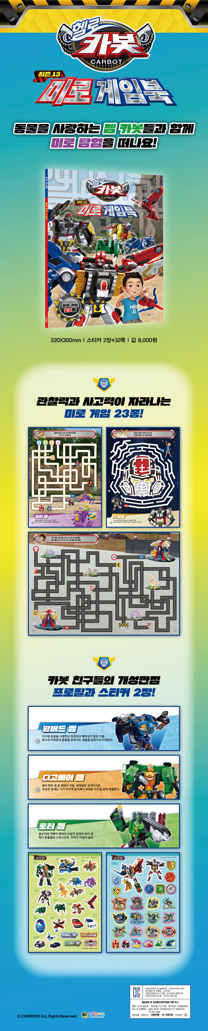 *23종의 미로 게임으로 관찰력과 집중력이 쑥쑥! 자라나요.카봇 친구들과 다양한 형태의 미로 게임을 풀어보며 관찰력과 집중력을 키워 보세요. 미로 게임과 함께 수록된 카봇 친구들의 개성 넘치는 프로필은 카봇 친구들과 더 친해질 수 있는 기회가 될 거예요! 미로 게임과 함께 즐기는 2장의 스티커도 함께 만나 보세요.