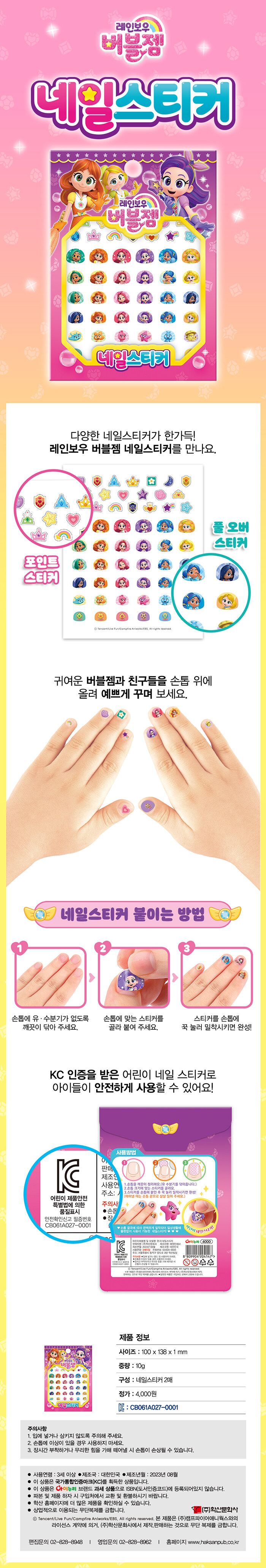 내 손으로 직접 꾸미는 네일아트. 블링블링 다양한 네일스티커로 손톱을 예쁘게 변신시켜 주자. 크기 별 손톱이 다양하게 들어 있어 내 맘대로 골라서 붙일 수 있다. 포인트를 줄 수 있는 데코스티커와 내가 좋아하는 캐릭터로 손톱 전체를 꾸밀 수 있는 풀오버스티커까지. 국내에서 제작하고 무독성 스티커로 안심하고 놀이하자.
