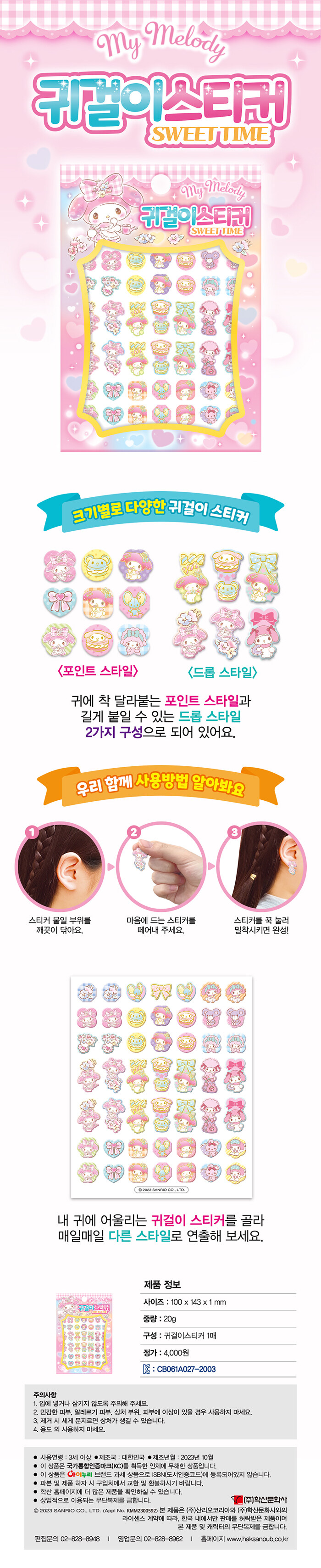 귀에 밀착되어 일상생활에 불편없이 사용이 가능한 붙이는 귀걸이스티커다. 귀여운 캐릭터와 아기자기한 그림으로 구성되어 있다. 다양한 귀걸이스티커로 블링블링하게 변신해 보자.