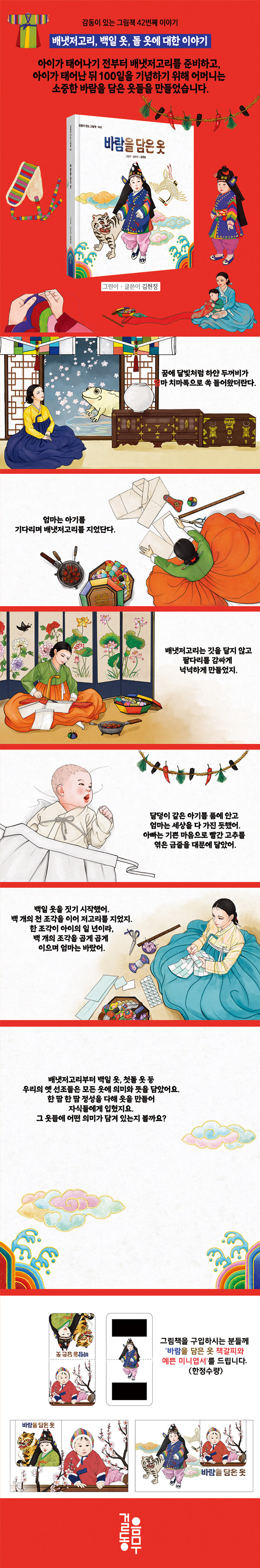 ■ 기획의도 및 책 소개작가는 한창 한복 기술을 배울 때, 박물관에 전시된 백쪽저고리를 본 충격이 매우 생생하게 남았습니다. 지금이야 공장에서 나온 기성복이 넘쳐나는 시대지만 그때는 여인들이 손바느질하여 옷을 지어야 했던 시절입니다. 백 개의 작은 천 조각을 마르고 바느질하여 옷을 지을 때, 어머니는 무슨 마음으로 그 수고로움을 견뎌내었을까요? 그저 내 아이가 이 옷을 입고 무병장수하며 무탈하게 자라길 바라는 마음. 바늘 한 귀에 작은 바람을 담아 한 땀 한 땀 옷을 지었던 어머니들의 마음을 그림책으로 담았답니다.