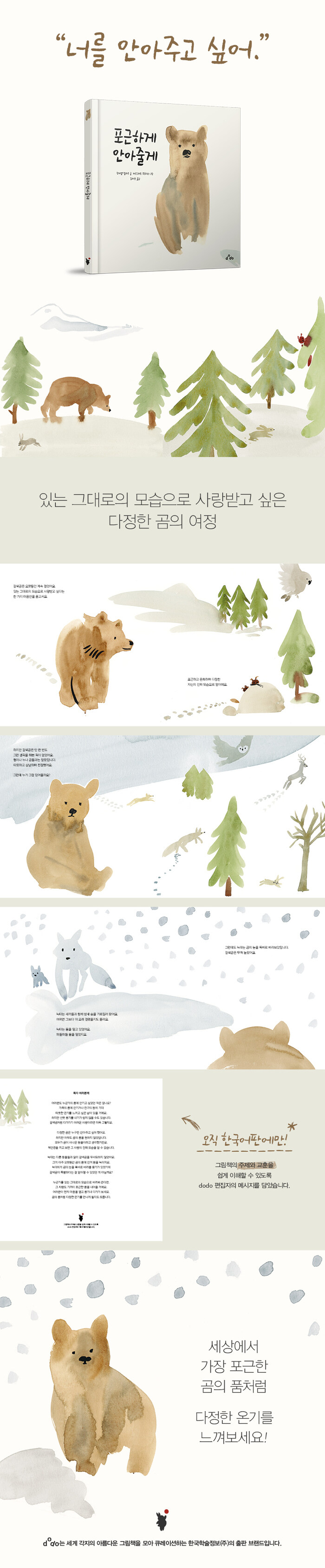 누군가를 있는 그대로의 모습으로 바라봐 준다면, 그 사람도 여러분에게 기꺼이 포근한 품을 내어줄 겁니다. 그런 시간들이 모이면 언젠가 여러분도 누군가에게 크고 포근한 품을 내어줄 수 있는 사람이 되어 있을지도 모르지요. 우리 모두 누구나 그런 다정한 마음과 따뜻한 온기를 가지고 있으니까요. 서로의 온기를 나누면 다정한 마음은 더욱 커지겠지요. 그러면 우리는 세상을 따뜻한 온기로 가득 채울 수 있을 거예요. ‘안아주다’라는 단어에는 다양한 의미가 담겨 있습니다. 누군가를 안아주는 ‘포옹’ 그 자체를 말하기도 하지만, 어쩌면 마음을 나누고 상대를 위하는 마음이 ‘포옹’의 모습으로 비추어질 수도 있지요. 이 책을 통해 우리가 안고 싶은 게 무엇인지, 우리의 작은 포옹이 이 세상에 어떻게 따스함을 전할 수 있을지 고민해 보면 좋겠습니다. 우선은 용기를 내서 가까운 사람에게 먼저 마음을 열고 다가가 보는 건 어떨까요? 곰의 품처럼 다정한 온기를 만나게 될지도 모르니까요.