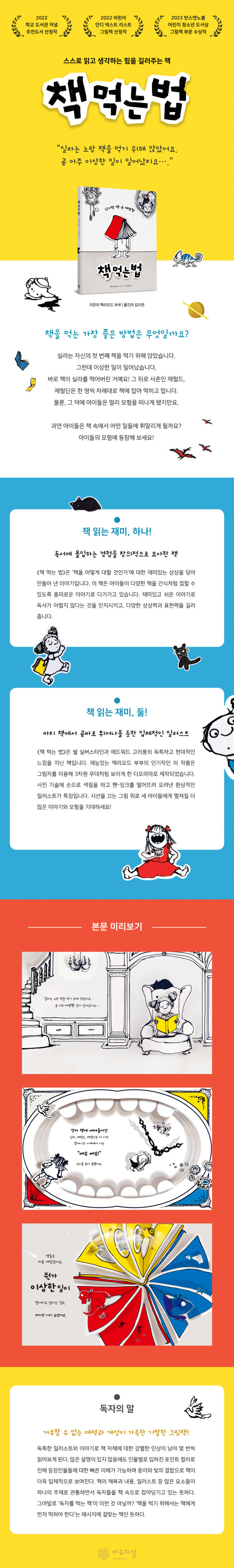 <독서에 몰입하는 경험을 창의적으로 묘사한 책>《책 먹는 법》은 ‘책을 어떻게 대할 것인가’에 대한 재미있는 상상을 담아 만들어 낸 이야기입니다. 이 책은 아이들이 다양한 책을 간식처럼 접할 수 있도록 흥미로운 이야기로 다가가고 있습니다. 재미있고 쉬운 이야기로 독서가 어렵지 않다는 것을 인지시키고, 다양한 상상력과 표현력을 길러줍니다.