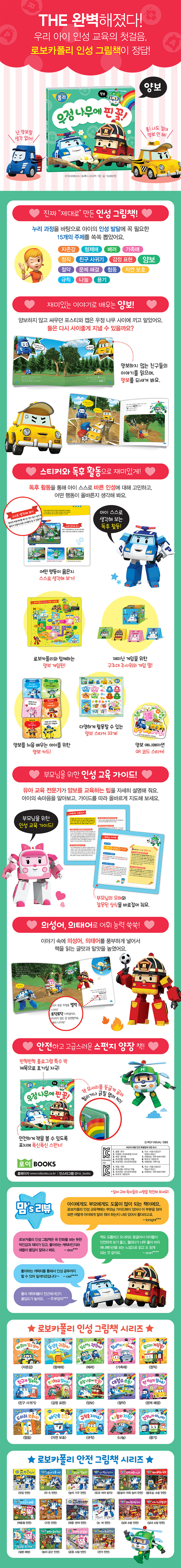 새로운 형식, 어린이 인성 교육 효과를 극대화시키는 독후 활동 강화!!!육아맘들 사이에 필수 육아템으로 소문난 《로보카폴리 인성 그림책》 시리즈가 업그레이드판으로 나왔어요! 누리 과정을 바탕으로 아이의 인성 발달에 꼭 필요한 주제만 골라 뽑아, 어린이의 눈높이에 딱 맞춘 인기 애니메이션 그림책으로 다시 펴냈어요. 단순한 책 읽기에서 끝나지 않도록, 그림책 내용과 연계한 다양한 스티커 활동과 만들기, 게임, 카드 등을 활용한 독후 활동을 강화하여 인성 교육 효과를 극대화했답니다. 이에 더하여 그림책 에피소드를 풀 영상으로 즐길 수 있는 QR 스티커까지 들어 있어 영상 연계 교육도 가능해요!