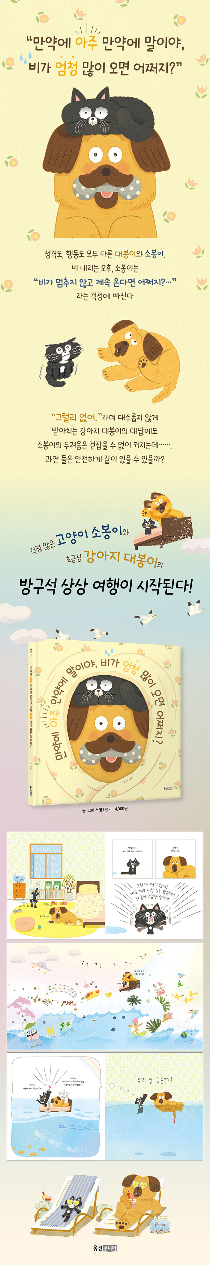 『만약에 아주 만약에 말이야, 비가 엄청 많이 오면 어쩌지?』는 누구나 가지고 있는 걱정과 두려움에 대해 ‘너는 못 하는 게 안 해본 거라며’ 든든한 용기를 건넨다. 소심한 마음에 용기 한 스푼을 뿌리며 조금 더 단단한 내일을 나아갈 모두에게 응원의 메시지를 던지는 그림책이다.