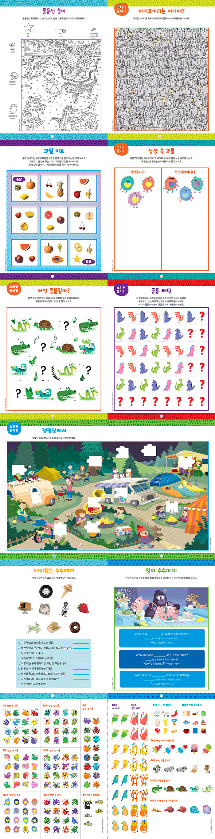수수께끼와 영어 단어 완성하기로 어휘력 늘리기!‘젖소가 가장 좋아하는 소스는 뭘까?’, ‘두 개의 바늘이 돌면서 숫자를 가리키는 것은?’과 같은 영어와 한글로 된 수수께끼를 즐겨 보세요. 또한 주어진 영어 단어에 덧붙여서 합성어를 완성해 보는 단어 완성하기도 해 보세요. 귀여운 스티커를 붙이며 재미있게 단어 놀이를 할 수 있어요. 영어로 생각하는 능력과 단어 어휘력도 높일 수 있답니다.