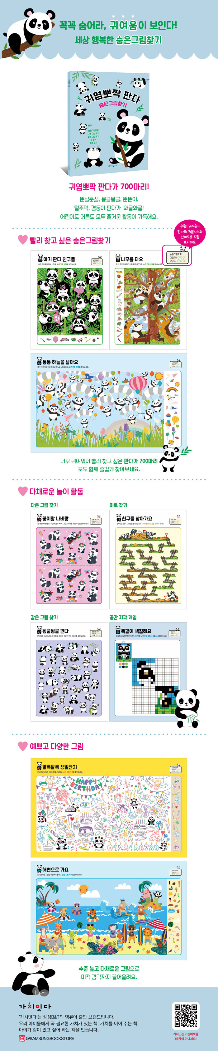 예쁘고 사랑스러운 그림이 가득한 책 속에 귀여운 판다가 700마리나 있다. 너무 귀여워서 빨리 찾고 싶은 판다가 페이지마다 가득가득하다. 판다와 친구들 찾기, 오밀조밀 물건 찾기, 맛있는 음식 찾기 등 다양한 숨은 그림과 다채로운 놀이 구성을 즐겨보자.