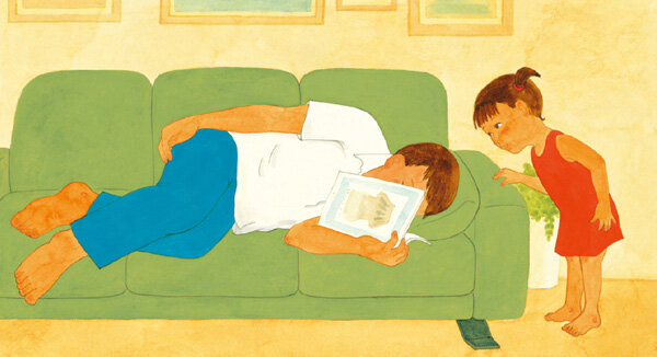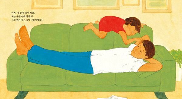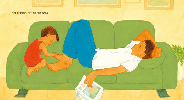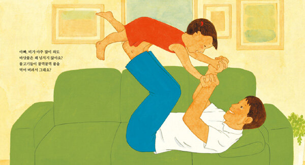 따뜻한 시선과 과장 없는 그림으로 표현한 우리의 일상이 책은 김미경 작가가 늦둥이 막내딸을 키운 경험을 바탕으로 만들었습니다. 그렇기 때문에 그림책의 주인공인 아이와 아빠를 바라보는 작가의 시선은 캐릭터에 대한 전지적인 시점이 아니라, 가족을 바라보는 따뜻한 엄마의 시선입니다. 이는 그림을 통해서도 드러납니다. 불필요한 묘사나 군더더기를 빼고 과장을 하지 않은 스케치와 채색은 평범하면서도 소중한 일상을 담백하게 보여주고 있습니다.