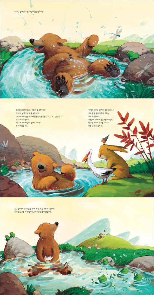 친구들과 사이좋게 어울려 함께 놀 때가 가장 재미있어요! 첨벙! 보가 커다란 물웅덩이로 뛰어들었어요. 그러고는 참방참방 물장구치며 재미있게 놀았지요. 그때 친구들이 찾아와 물웅덩이에서 함께 놀아도 되는지 물었어요. 하지만 보는 친구들을 끼워 주지 않았어요. 친구들은 몹시 서운했지만, 하는 수 없이 발걸음을 돌렸지요.