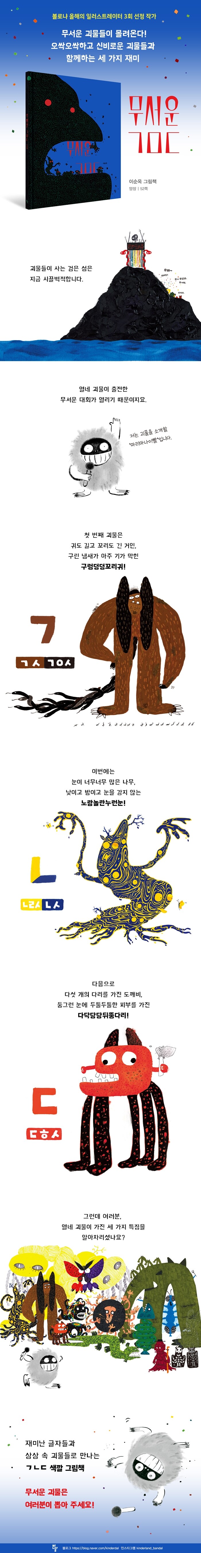 볼로냐아동도서전 ‘올해의 일러스트레이터’에 3회 선정된 이순옥 작가가 이번에는 기발한 발상과 재미난 표현으로, 무섭고 오싹한 우리 말 그림책을 지었다. 한글의 기본인 열네 자의 자음을 하나하나의 괴물들로 표현한 이 그림책은, 한글의 각 낱자로 시작되는 말로 이름을 짓고, 다양한 단어들로 설명하고 있다.