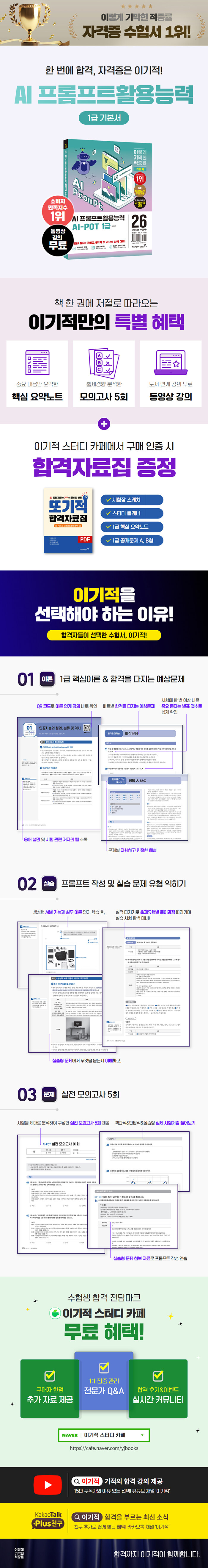- 또기적 합격자료집 & 스터디 카페 학습 지원'이기적 스터디 카페'에서 도서 구매 인증을 완료한 분들께는 1급 이론의 주요 개념을 한눈에 정리한 '핵심 요약 노트'와 시행처의 '1급 공개문제 A, B형' PDF 파일을 추가로 제공합니다. 또한 이기적 스터디 카페(https://cafe.naver.com/yjbooks) AI-POT 게시판에서는 저자가 직접 공유하는 시험 관련 유용한 정보와 추가 학습 자료도 받아볼 수 있습니다. 여러분의 합격을 이기적이 응원합니다!