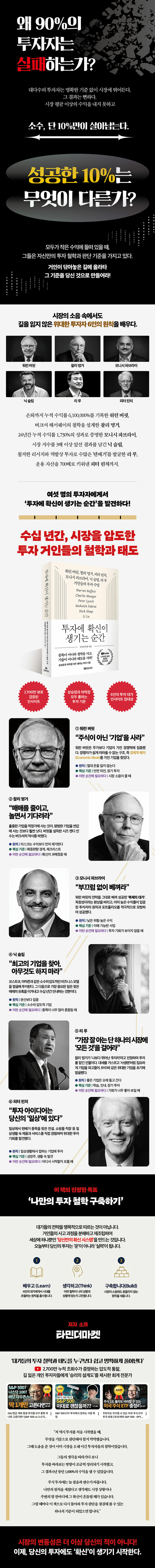 주식 시장의 G.O.A.T 6인—워런 버핏, 찰리 멍거, 피터 린치, 모니시 파브라이, 닉 슬립, 리 루. 살던 시대도, 투자 대상도, 스타일도 달랐던 이들이 반세기 가까운 시장의 변동성에서도 살아남을 수 있었던 이유는 분명했다. 그들은 모두 어떤 종목을 살지에 집착하지 않고 분명한 ‘판단의 기준’으로 투자했다는 점이다. 《투자에 확신이 생기는 순간》은 여섯 명의 거인이 지켜온 판단의 구조를 하나의 흐름으로 정리한 책이다. 어떤 위기에도 무너지지 않는 ‘단단한 투자 기준’을 세우는 가장 완벽한 실전서다.