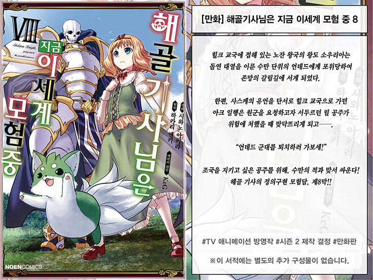 대인기 '해골기사님' 시리즈가 마침내 코믹스로 등장!!눈을 떠 보니 MMORPG 캐릭터의 모습으로 이세계에 떨어진 아크. 그 모습은 겉은 갑옷, 속은 전신골격이라는 '해골기사'였다.