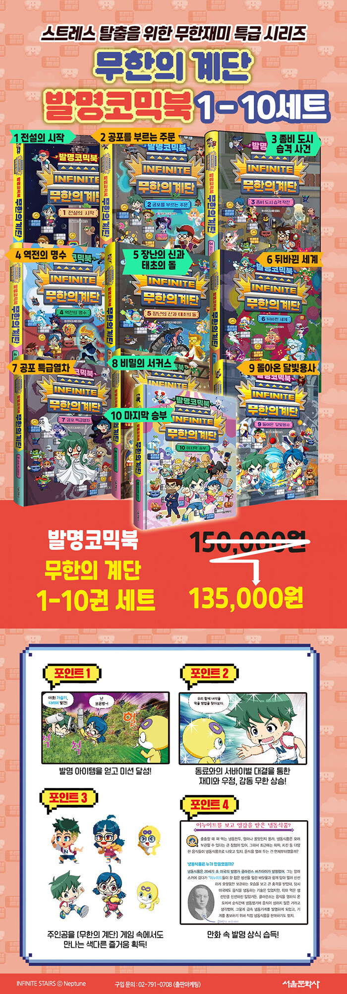 이 책은 <무한의 계단>의 세계관에 ‘발명’이라는 주제를 결합한 코믹북으로, 주인공 한이·단이·피니의 모험을 따라가며 다양한 발명 상식을 자연스럽게 익히도록 구성했다. 미션과 서바이벌, 실패와 재도전을 거치며 목표를 향해 나아가는 과정 속에서 읽는 즐거움과 함께 성장의 의미를 전한다.