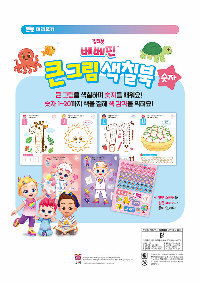 베베핀 가족과 놀이하듯 익히는 1~20까지의 수학 기초 학습!《핑크퐁 베베핀 큰 그림 색칠북 ‘숫자’》는 아이가 커다란 그림에 색칠하고, 쓰고, 읽고, 스티커를 붙이며 자연스럽게 숫자의 기본 개념을 익히는 유아 맞춤형 숫자 워크북입니다. 숫자 ‘1~10’, ‘11~20’까지 단계별로 구성되어 있어 놀이하듯 수학의 기초 원리를 배울 수 있습니다.