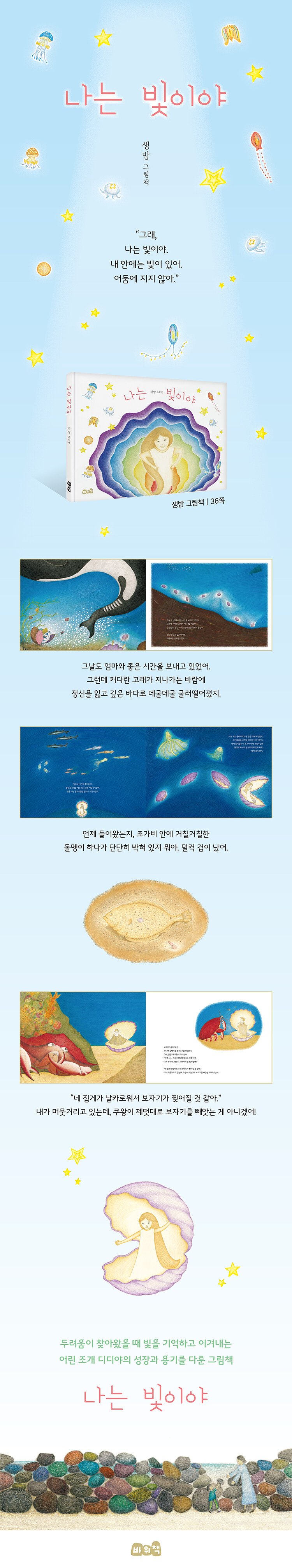 누구에게나 마음속에 박힌 돌멩이 같은 상처가 있습니다. 상처는 분명 아프고 고통스러운 것이지요. 하지만 두려움을 주는 ‘어둠’을 거절하고, 밝은 마음을 주는 ‘빛’을 바라본다면, 어느 순간 상처가 진주처럼 귀한 보석으로 바뀌어 있는 걸 발견하게 될 거예요. 어려운 문제 앞에 홀로 서 있는 세상의 모든 아이들이, 디디야가 그랬듯이 “나는 빛이야!”라고 말하며 마음에 찾아오는 두려움을 물리치고 멋지게 헤쳐 나가기를 바랍니다.