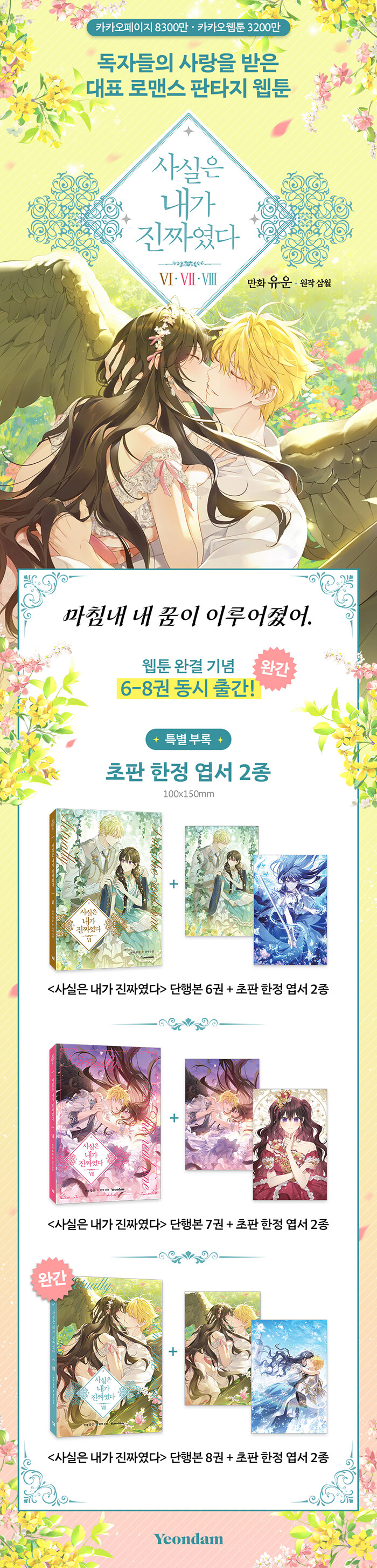 로맨스 판타지 웹툰 『사실은 내가 진짜였다』 6권 출간!카카오페이지 8,300만, 카카오웹툰 3,200만 독자들을 매료시킨 로맨스 판타지 대표 웹툰 『사실은 내가 진짜였다』의 단행본 6, 7, 8권이 연담에서 동시 출간되었다. 웹툰 『사실은 내가 진짜였다』는 삼월 작가의 동명 웹소설을 원작으로 하였으며, 원작에서 풀어낸 여주인공의 성장 스토리에 로맨스 요소를 강화해 화제가 되었다. 데뷔작임에도 불구하고 안정적인 유려한 작화와 화려한 연출로 독자들의 호평을 받은 유운 작가는, 단행본에 맞춘 연출을 추가하여 웹툰과는 다른 단행본만의 재미를 끌어내고자 하였다.