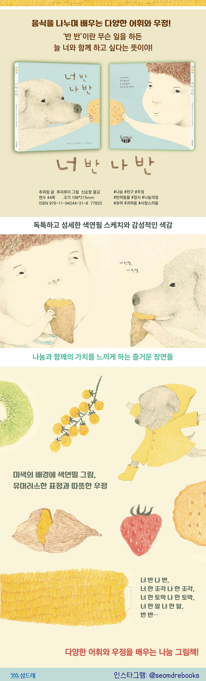 음식을 나누며 배우는 우정과 다양한 어휘를 담은 그림책이다. 너 반, 나 반이라는 말 속에 늘 함께하고 싶은 마음을 담았다. 아이와 반려견이 과자와 고구마, 딸기를 반씩 나누며 나눔의 기쁨과 솔직한 속마음을 드러낸다. 반복과 변주 속에서 우리말 어휘의 재미를 자연스럽게 익힌다.