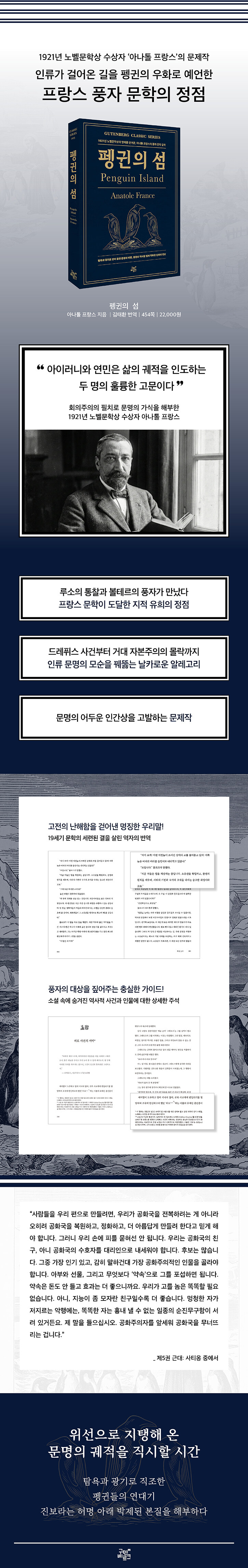 구텐베르크 출판사에서 새롭게 펴낸 『펭귄의 섬』은 아나톨 프랑스 소설 특유의 반어법과 냉소적인 유머를 현대적인 감각으로 되살려냈다. 특히 20세기 문학의 우아한 문체를 사랑하는 역자의 손길을 거쳐, 난해할 수 있는 풍자적 맥락을 명쾌하게 풀어냈다. 또한, 독자의 이해를 돕기 위해 소설 속에 숨겨진 역사적 배경(드레퓌스 사건, 프랑스 혁명 등)을 친절한 주석으로 풀어내어 알레고리가 주는 지적 즐거움을 배가시켰다.