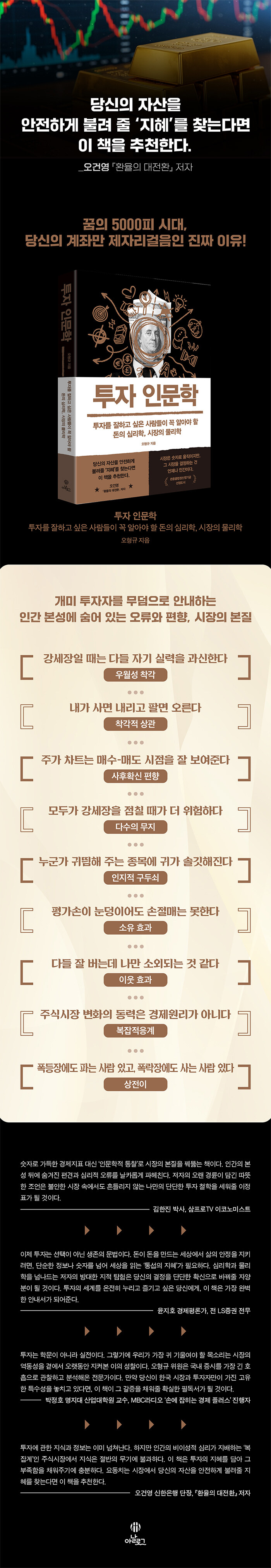35년간 경제기자로 일하며 딱딱하고 난해한 경제를 쉽고 흥미롭게 전하는 것을 평생의 소명으로 삼아왔다. 인문대 출신으로서 치열한 경제 현장을 취재하며 얻은 깨달음은 명확하다. 경제란 단순히 차트나 수학적 법칙의 산물이 아니라, 욕망과 공포를 가진 ‘인간’들이 만들어내는 거대한 심리의 복잡계라는 사실이다. 정치, 역사, 문화와 마찬가지로 경제 역시 인간이 빚어내는 드라마이기에, 수학적 분석을 넘어 문학, 역사, 철학, 물리학을 아우르는 융·복합적 접근이 필수적이라고 믿는다. 이 책은 그 같은 생각을 종합한 결과물로, ‘돈은 심리학의 현미경으로, 시장은 물리학의 망원경으로 들여다봐야 한다’는 통찰을 통해 투자자들에게 명확한 이정표를 제시한다.서울대학교 국어국문학과를 졸업하고 서강대학교 경제대학 원에서 석사 학위를 받았다. 한국경제신문에서 경제부, 증권부, 유통부 등을 거쳐 논설위원과 논설위원실장을 지냈다. 현재 한국경제TV 전문위원으로 매주 금요일 ‘경제전쟁 꾼’을 진행하며 대중과 소통하고 있다.주요 저서로 『경제로 읽는 교양 세계사』, 『보이는 경제 세계사』, 『경제학, 인문의 경계를 넘나들다』, 『오락가락 선택은 어려워: 커너먼이 들려주는 행동 경제학 이야기』, 『10대에게 권하는 경제학』, 『치명적인 금융위기, 왜 유독 대한민국인가』, 『대우 패망 비사』 (공저)가 있다.