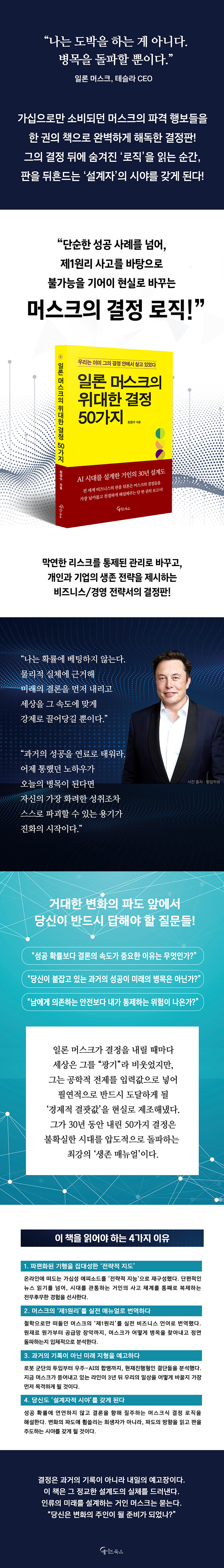 단 한 권의 지침서최근 TV와 신문, 유튜브, SNS 등은 온통 일론 머스크의 이야기로 도배되다시피 한다. 하지만 그저 ‘쇼츠’나 ‘릴스’로 소비되는 자극적인 장면들 속에서 우리는 정작 중요한 것을 놓치고 있다. 사람들은 그를 무모한 도박사나 괴짜로 치부하지만, 사실 그는 단 한 번도 운에 기댄 베팅을 한 적이 없다. 우리가 수많은 천재 경영자를 뒤로하고 머스크의 입에 매달리는 이유는 명확하다. 그는 남들이 미래를 점칠 때 물리학과 비용 구조라는 자를 들고 직접 미래를 ‘조각’해버리는 설계자이기 때문이다. 이 책은 그동안 베일에 싸여 있던 그의 ‘승부수’ 이면을 낱낱이 파헤친다. 화려한 결과 뒤에 숨겨진 서늘한 계산법과 공학적 논거를 복원해, 독자들이 “그는 대체 무엇을 보았기에 이런 미친 선택을 했는가”라는 본질적인 질문에 대한 답을 찾도록 몰아붙인다.