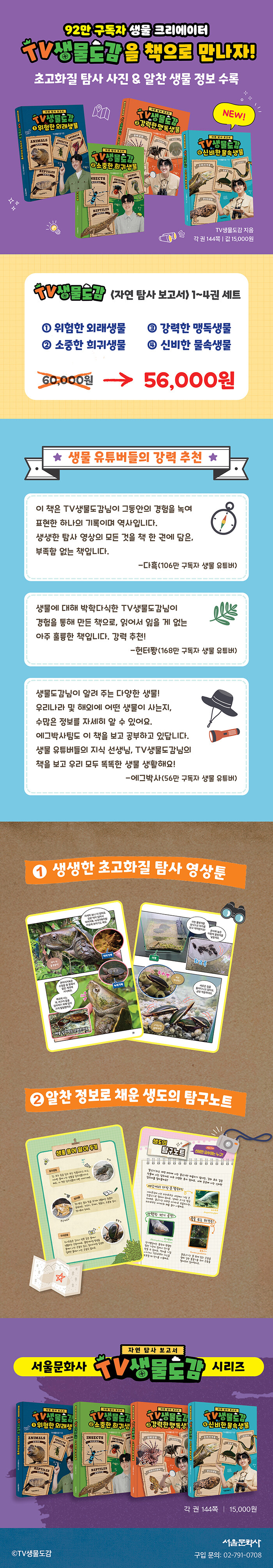 90만 구독자 생물 크리에이터 TV생물도감의 자연 탐사 시리즈. 생물도감이 대한민국과 세계 곳곳을 다니며 기록한 초고화질 자연 탐사 영상툰과 알찬 생물 정보를 만나 보자.